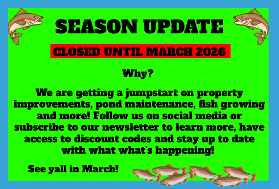Our stocked ponds ensure a quick catch, with trout ranging 10–16 inches. For groups, sharing poles is best—it’s that fast!